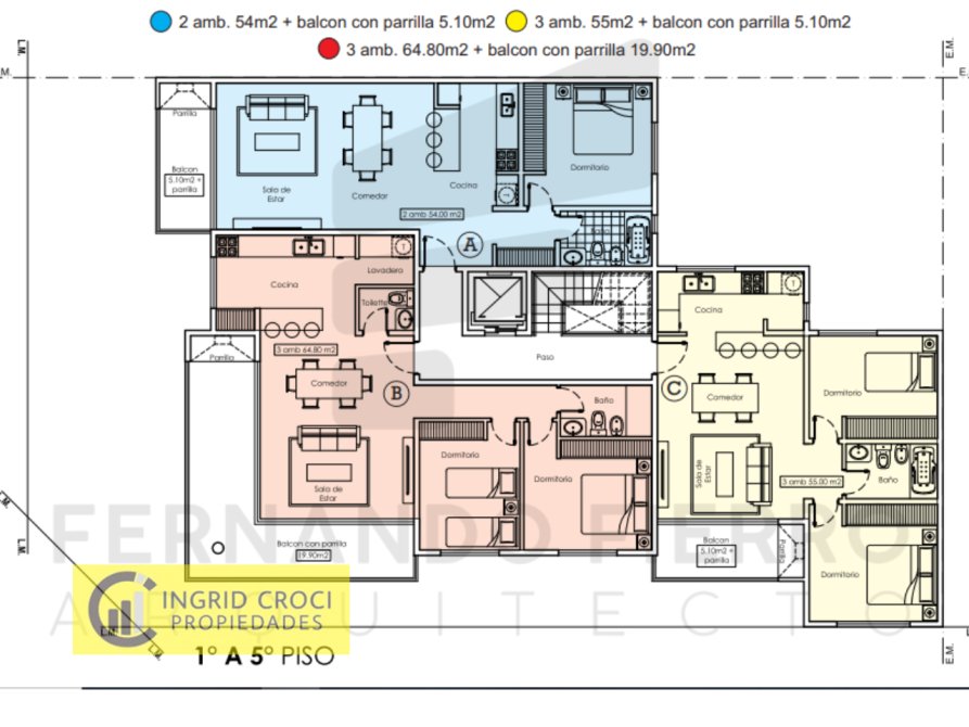 2° PISO A y B SEMI PISO, 3 ambientes, 143m2 + de 25 m2 de balcón.................DISPONIBLE. 2° PISO C, 3 ambientes. 55m2 + 5.10m2 de balcón. Total: 60.10 m2......................DISPONIBLE.