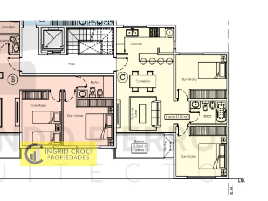 5° PISO C, 3 ambientes. 55m2 + 5.10m2 de balcón. Total: 60.10 m2......................NO DISPONIBLE.