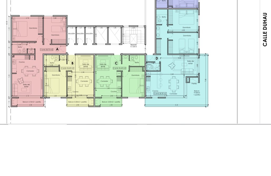 Los departamentos G -superficie total de 48.40m2 - son de 2 ambientes Frente a calle DUHAU